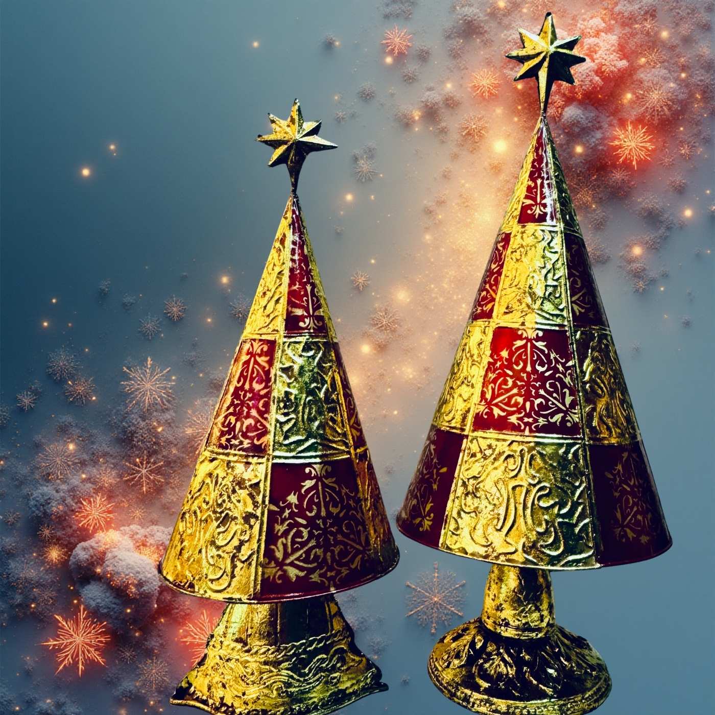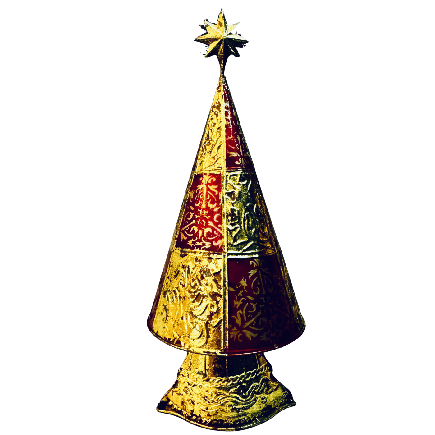 Deliziosa decorazione natalizia realizzata in latta dipinta, nei toni caldi e raffinati dell’oro e del bordeaux.
