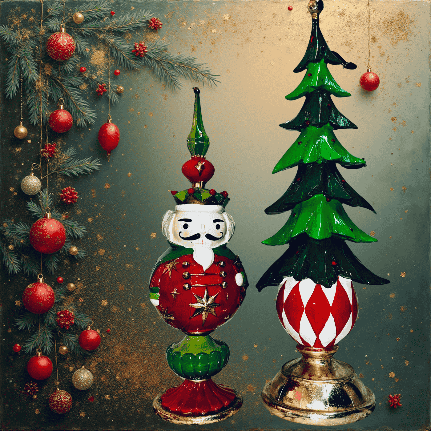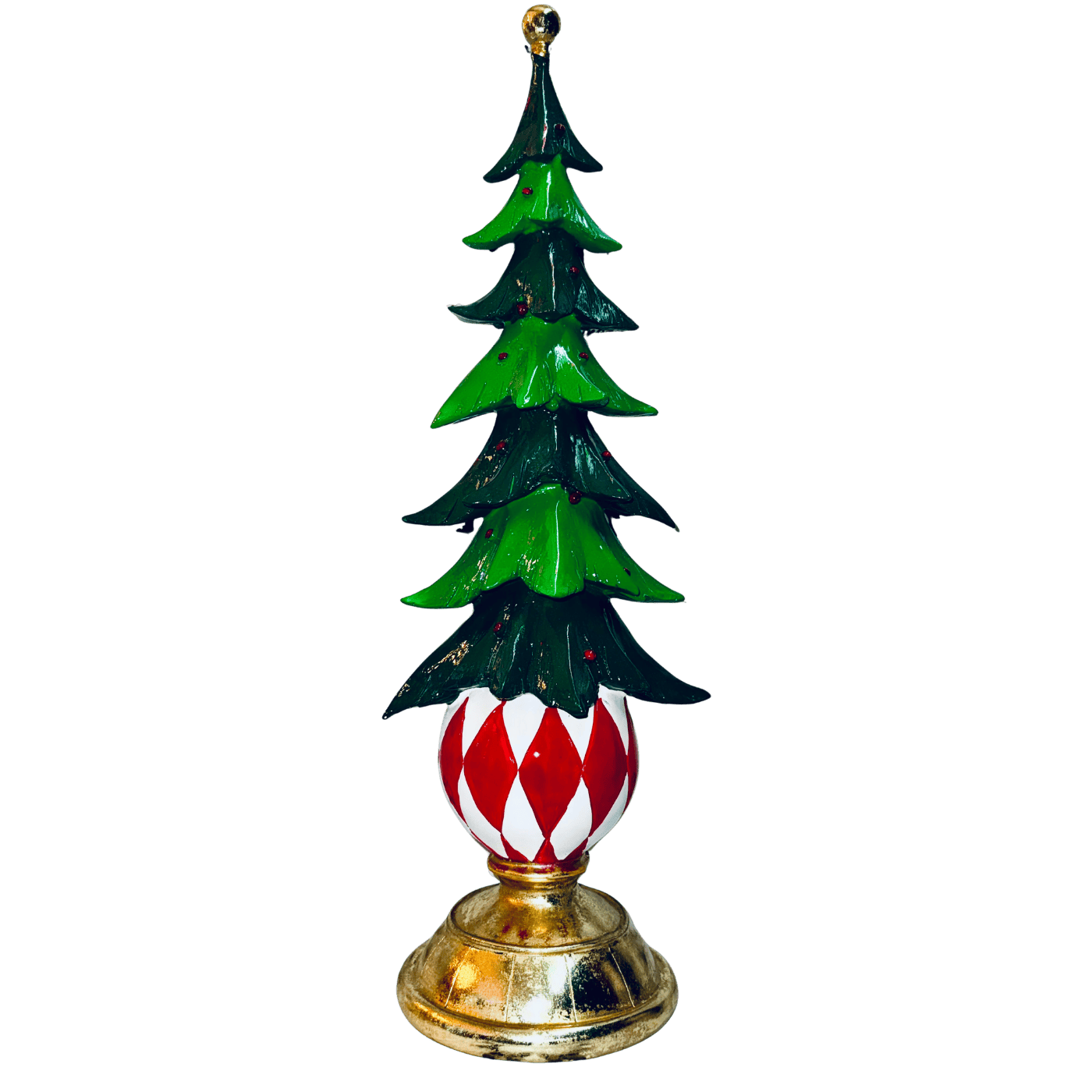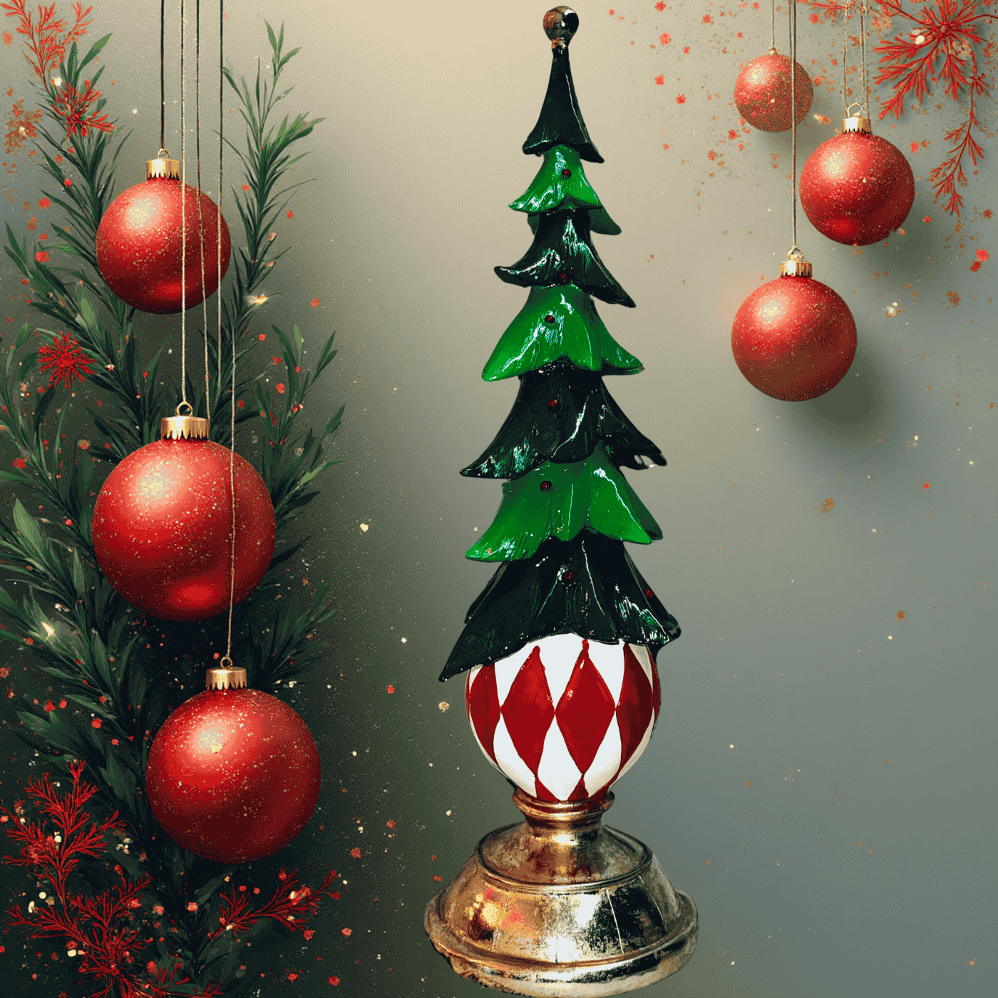 Un raffinato albero decorativo in resina, caratterizzato da un originale motivo a scacchi e poggiato su una palla ornamentale che ne esalta l’equilibrio e la raffinatezza.