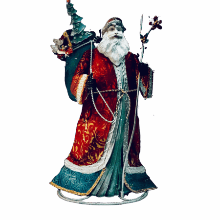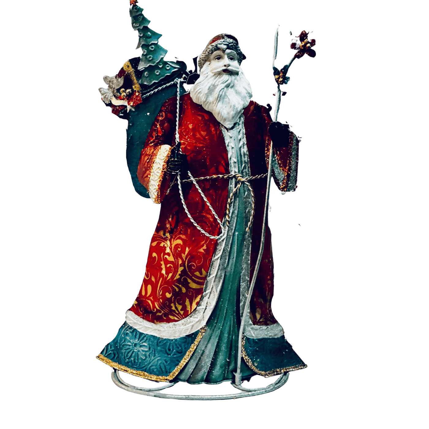 Elegante decorazione natalizia realizzata in latta dipinta a mano, con dettagli finemente colorati e glitterati che donano luminosità e fascino. La figura, alta circa 40 cm, rappresenta Babbo Natale in posizione eretta, perfetta come oggetto d’appoggio su tavoli, mensole, caminetti o vetrine. Un complemento ideale per arricchire l’atmosfera delle feste natalizie con un tocco vintage e artigianale.