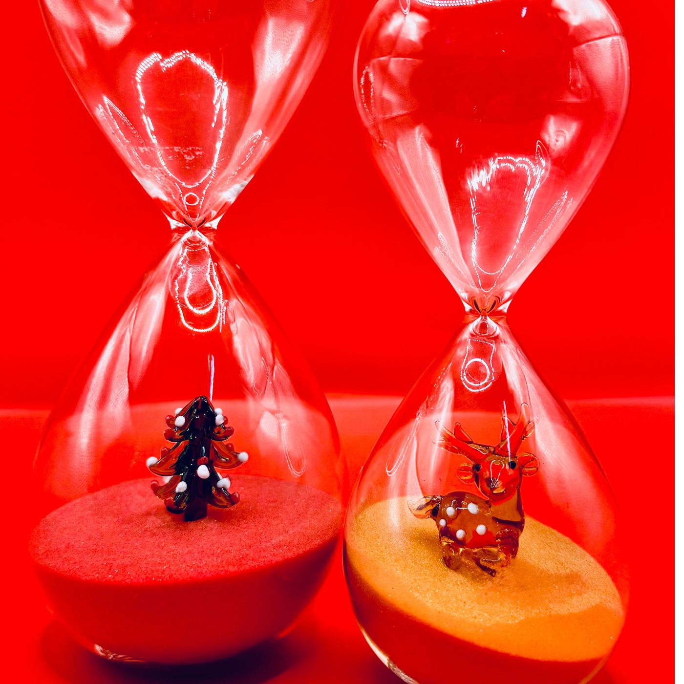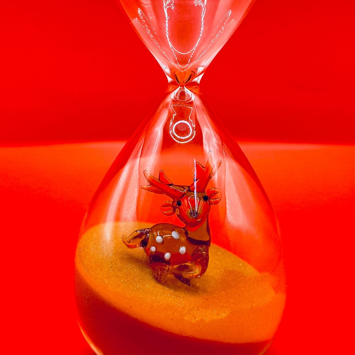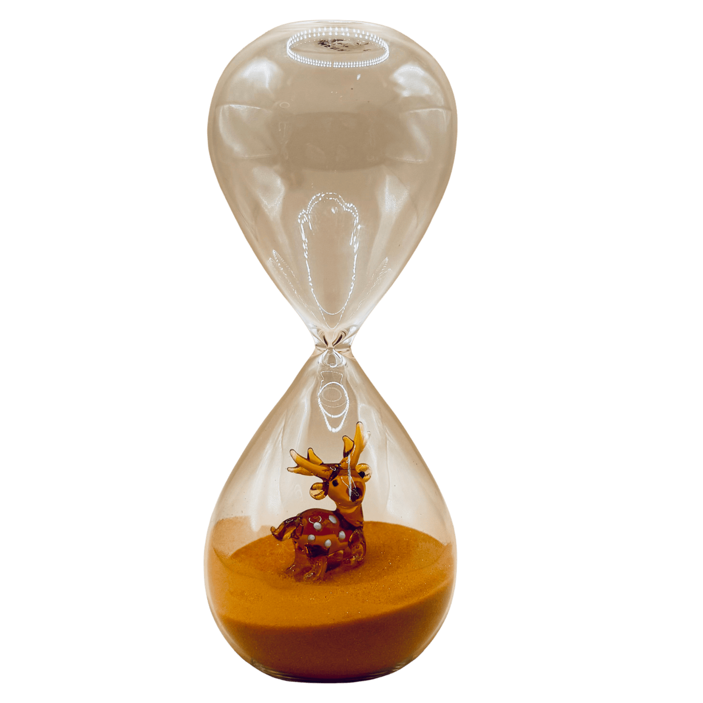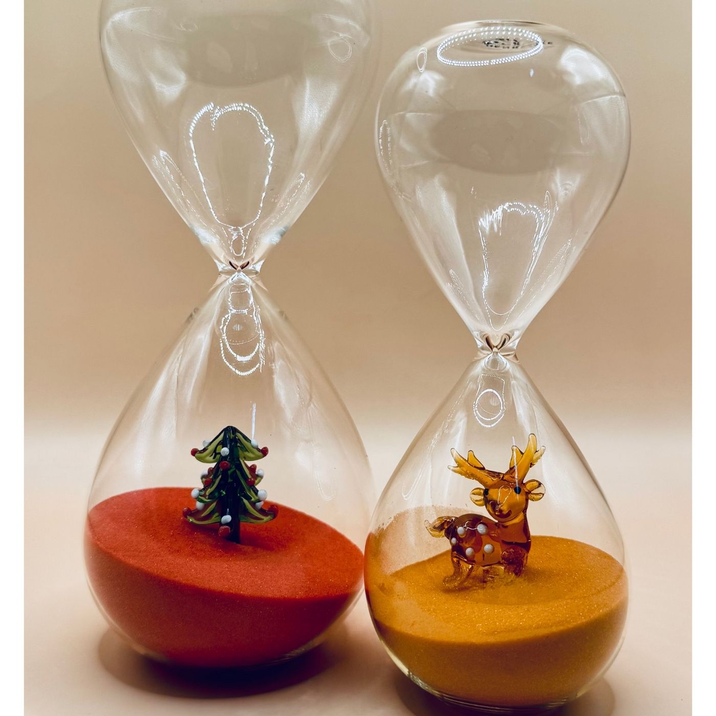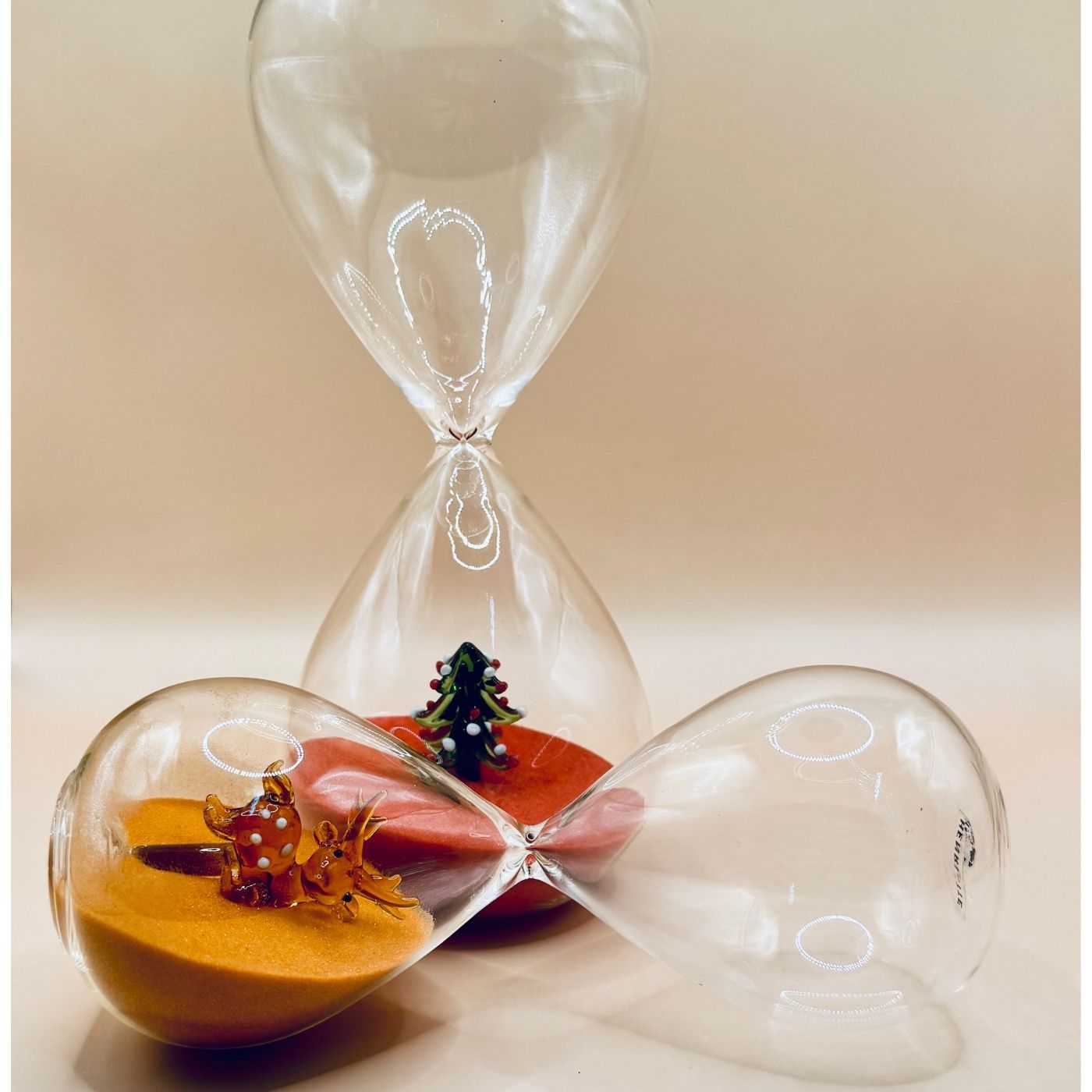 Un raffinato carillon del tempo natalizio: una clessidra in vetro trasparente impreziosita da una delicata renna decorativa al suo interno e da sabbia color arancio, calda e luminosa come la magia del Natale.