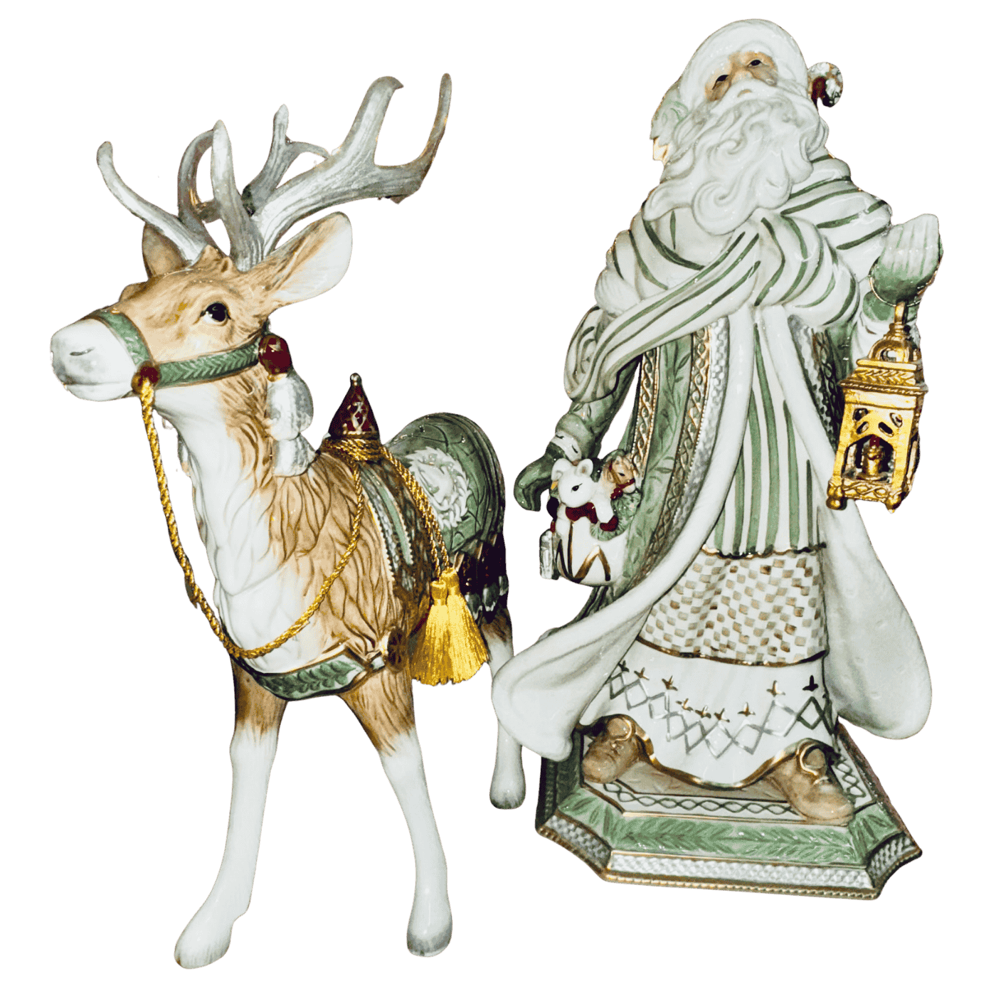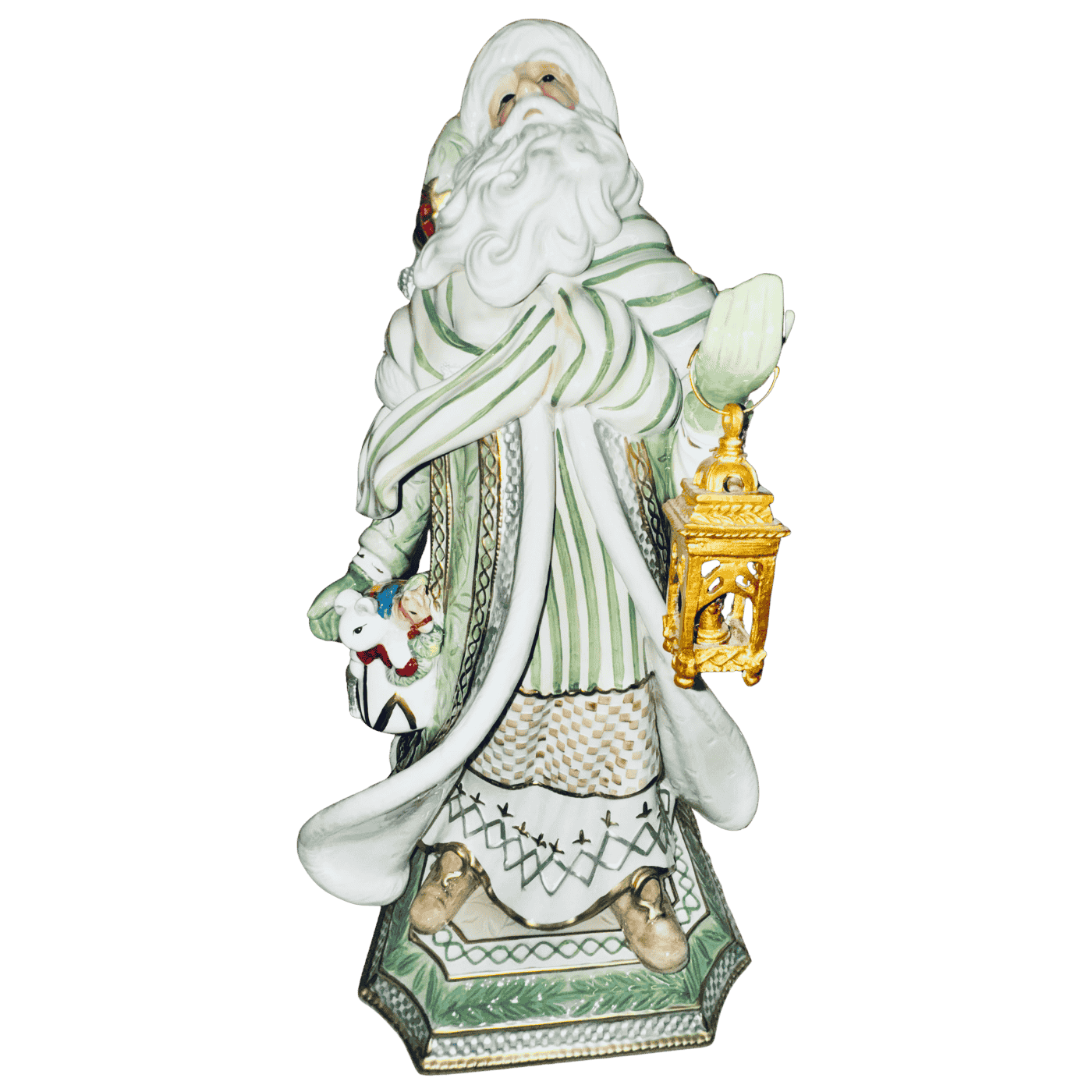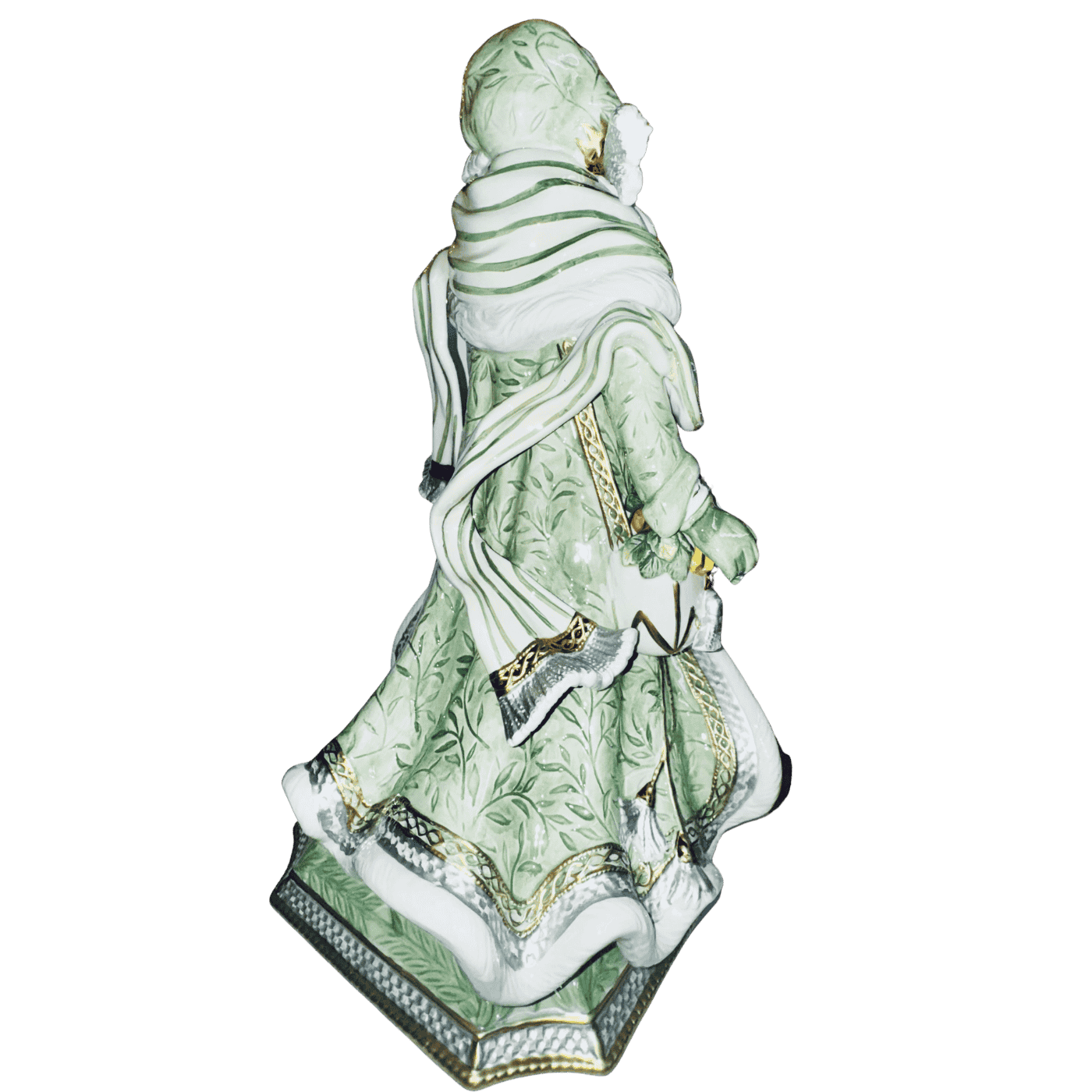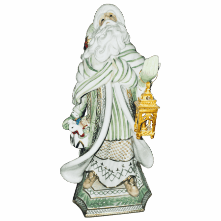 Con dimensioni imponenti di 31×52 cm, la statua raffigura Babbo Natale avvolto in un cappotto verdino dai toni morbidi, arricchito da decorazioni bianche e dettagli oro che ne esaltano la luminosità e il pregio artigianale. Le finiture smaltate, le cuciture in rilievo e gli ornamenti dorati riflettono l’inconfondibile stile ricco e ornamentale del marchio Fitz & Floyd.