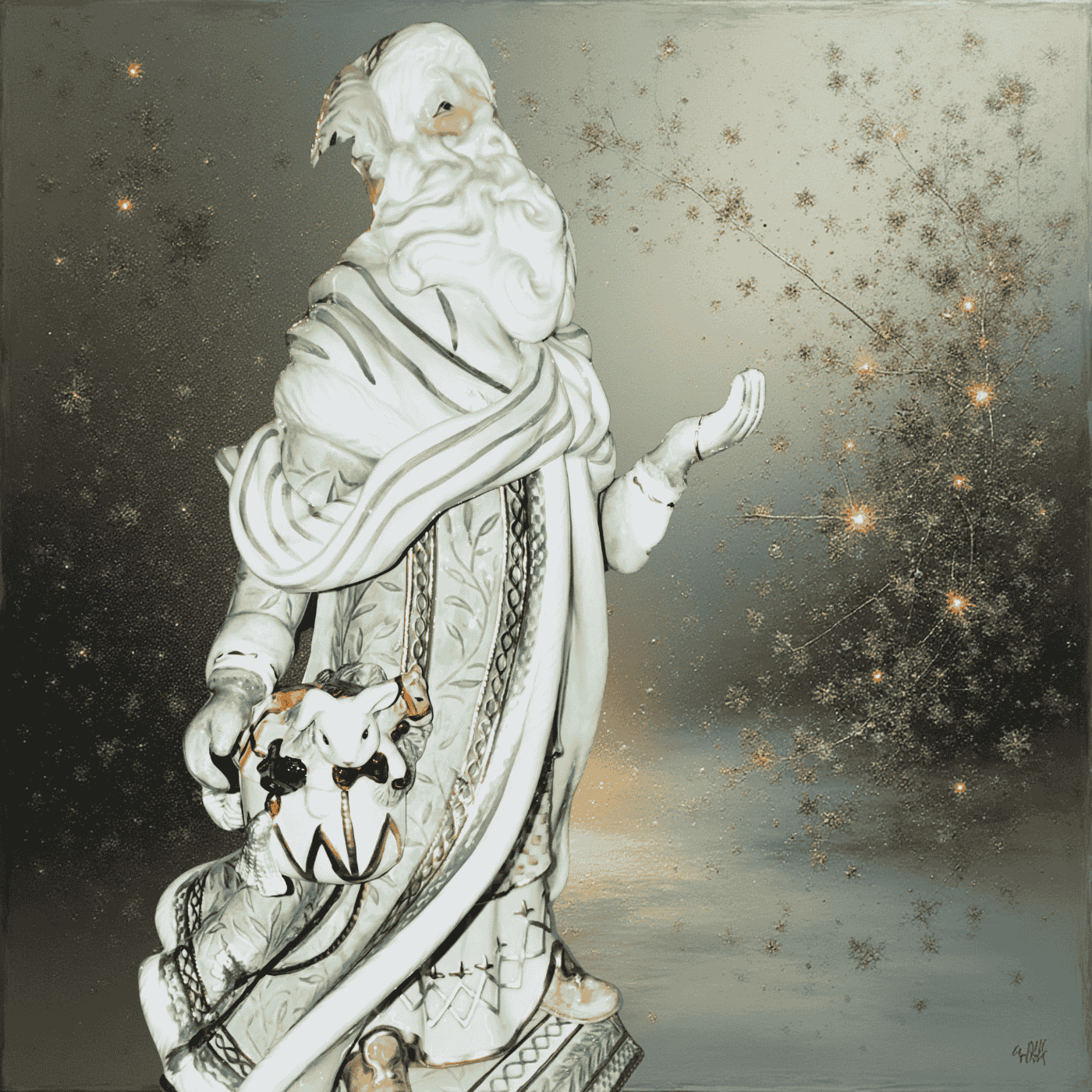 La posa solenne, il volto espressivo e la cura minuziosa dei particolari – dalla barba finemente modellata agli accessori decorativi – rendono questa figura un autentico pezzo da collezione. Perfetta come centrotavola scenografico, per l’ingresso, il soggiorno o una vetrina natalizia di grande effetto.