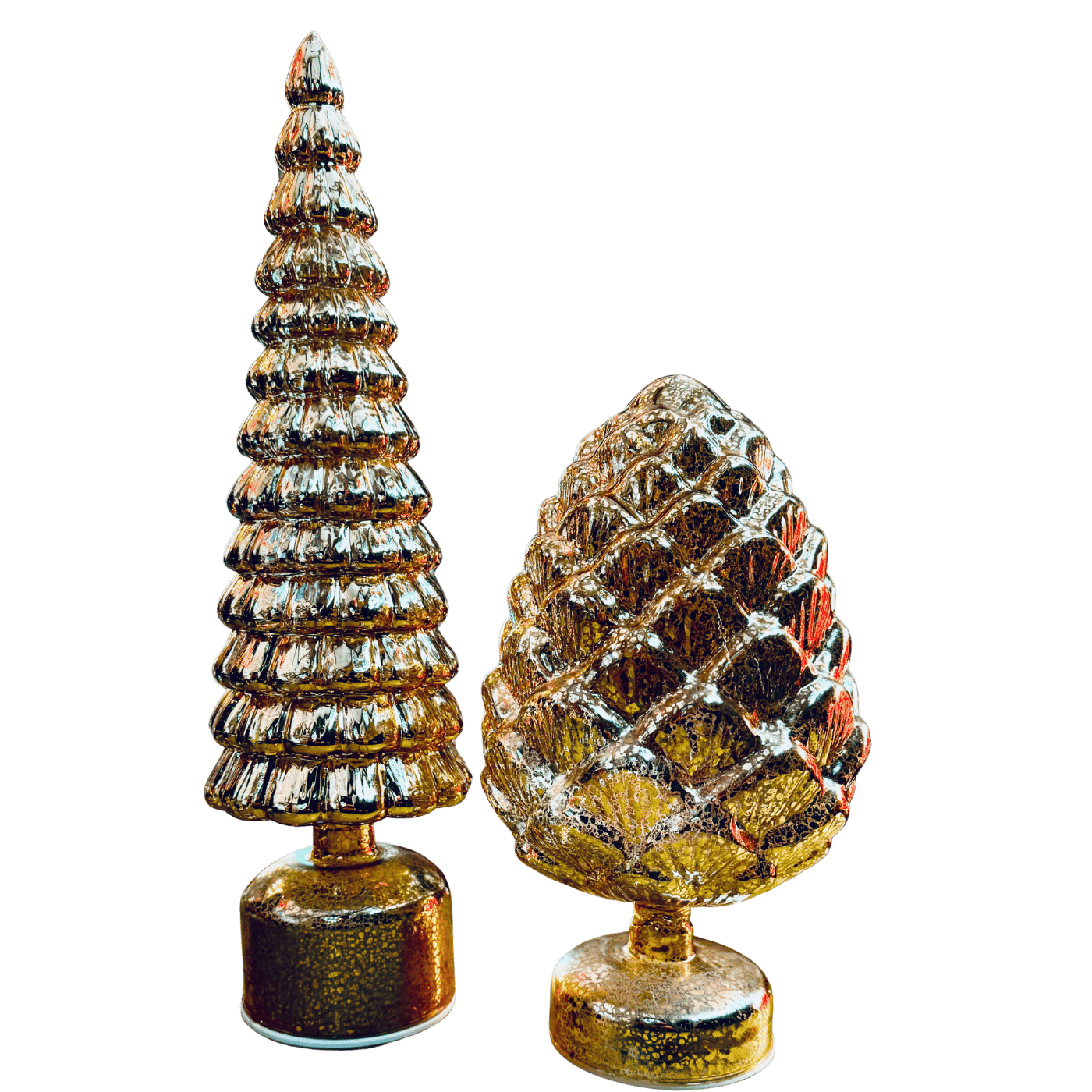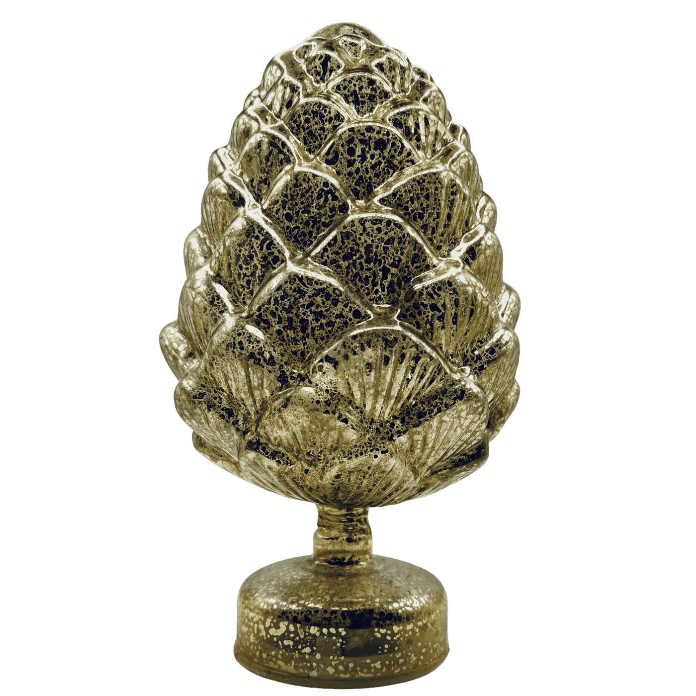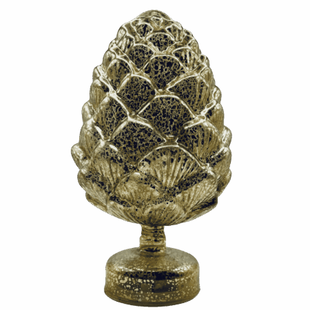 Un’elegante pigna decorativa in vetro color oro, arricchita da luci interne con movimenti luminosi che creano un suggestivo effetto scintillante.