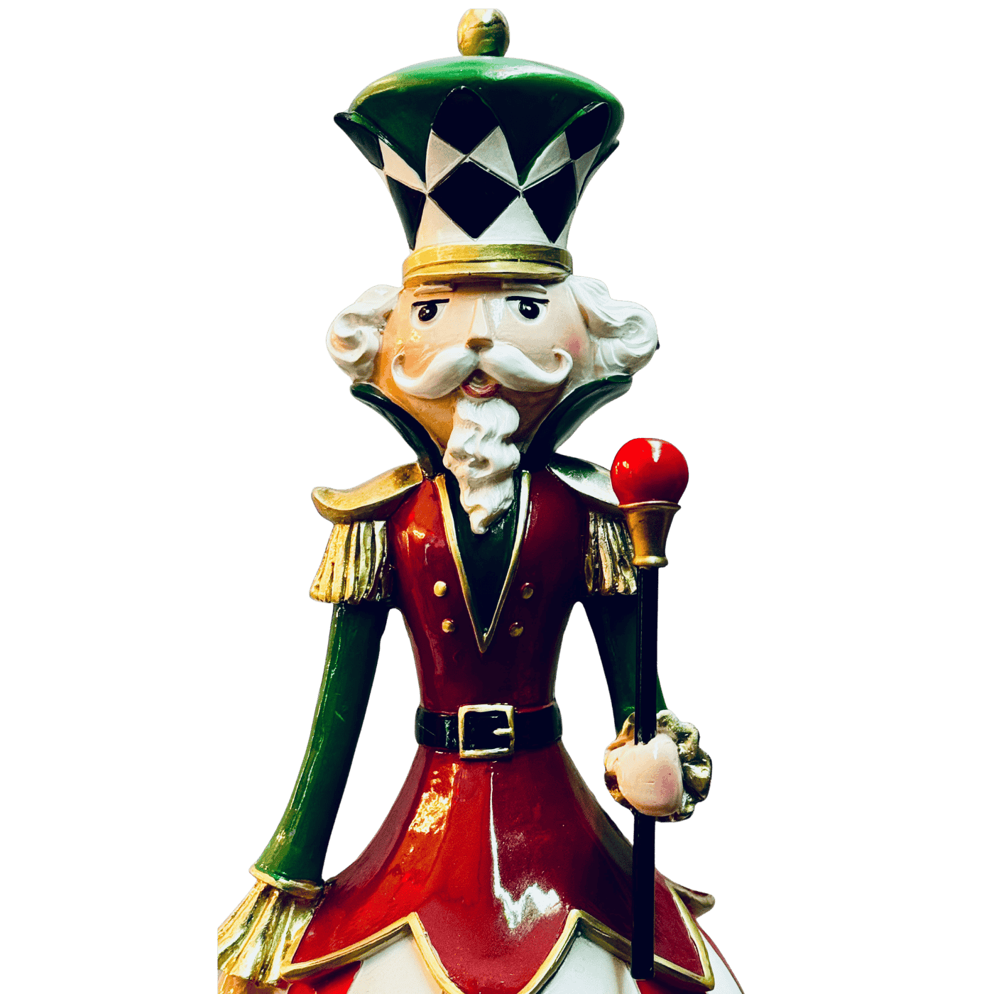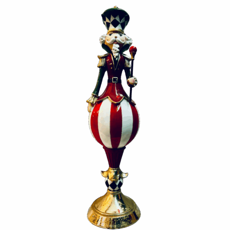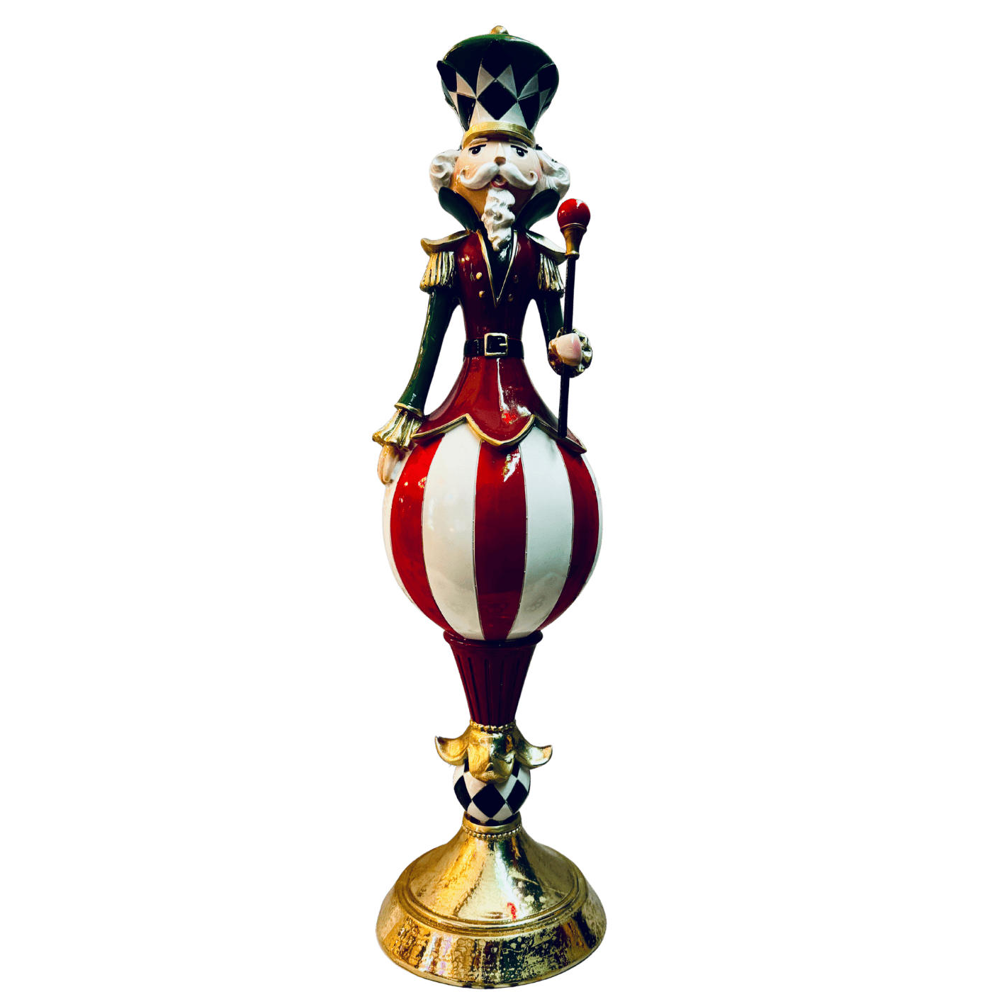 Maestosa figura in resina raffigurante un Re in stile Schiaccianoci, poggiato su una palla decorativa nei toni bianco e rosso, simbolo del Natale tradizionale.