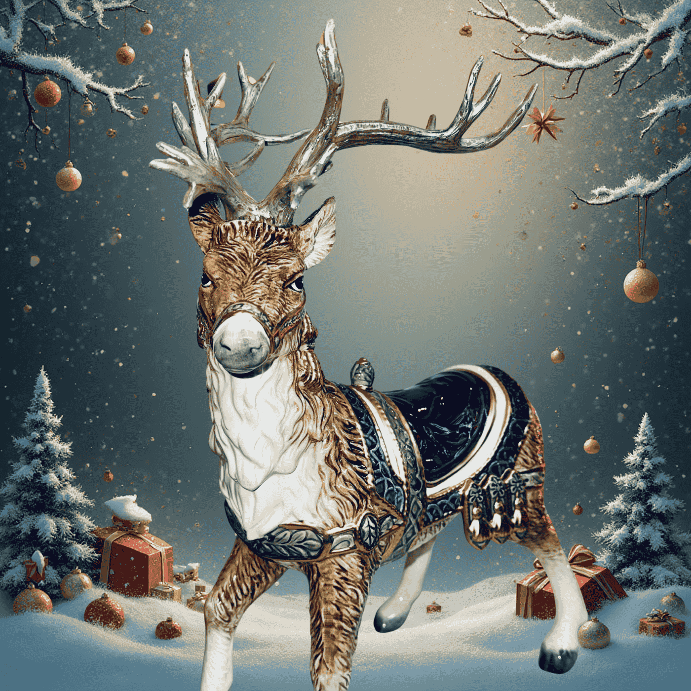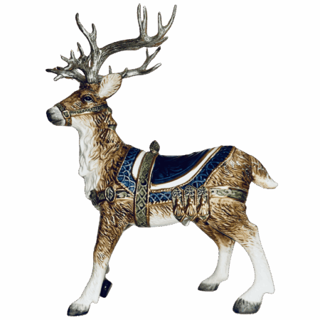 La figura, alta circa 40 cm, presenta una renna slanciata e maestosa, impreziosita da una finitura blu profonda, arricchita da motivi decorativi dorati e bianchi che donano luminosità e un’eleganza senza tempo. Le superfici smaltate e le applicazioni ornamentali mettono in risalto la lavorazione artigianale, rendendo ogni pezzo unico.