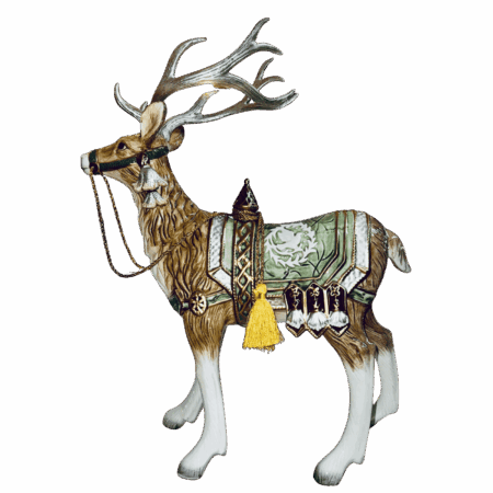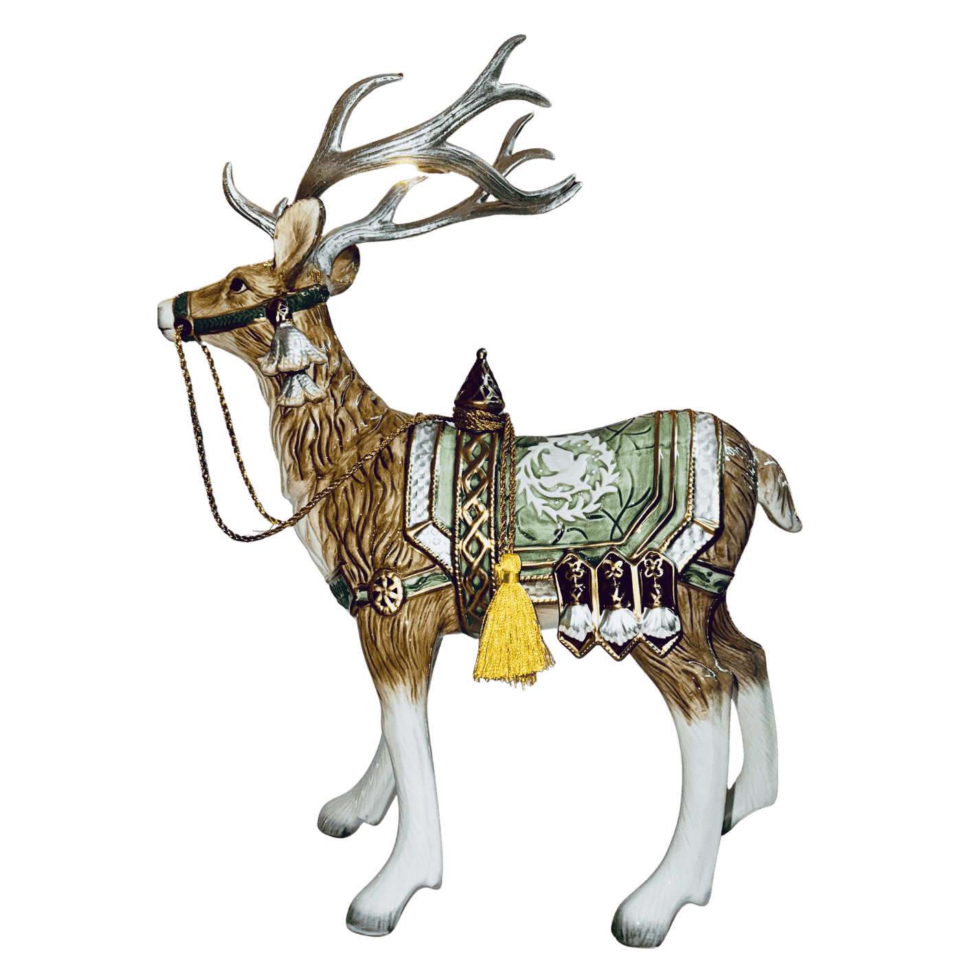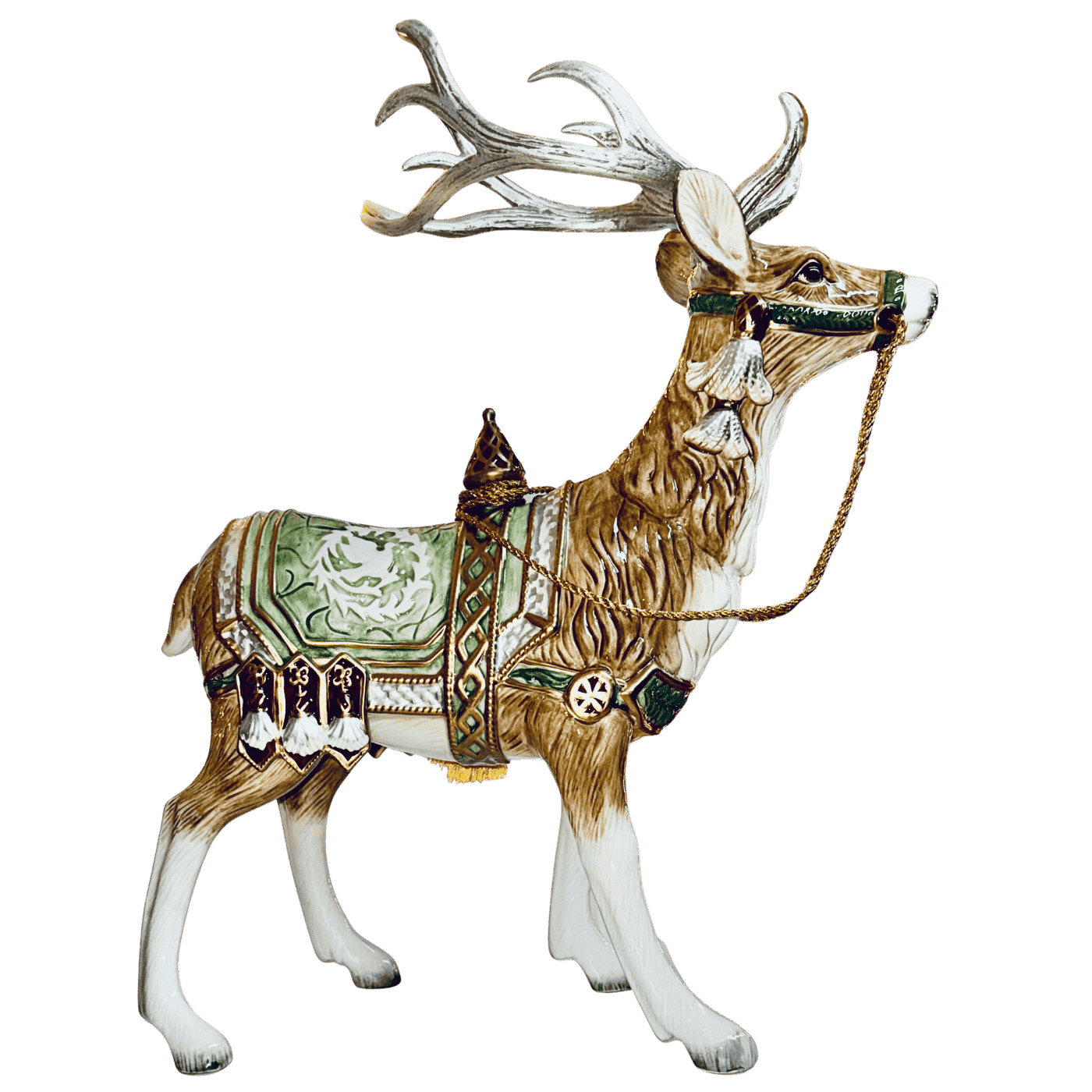 Il corpo smaltato, le decorazioni curate e le finiture dorate sui motivi, sulla sella o sugli elementi ornamentali conferiscono alla renna un aspetto luminoso e di grande pregio. Le proporzioni importanti la rendono perfetta come centrotavola, punto focale per un ingresso, una vetrina natalizia o un angolo decorativo dedicato alle feste.