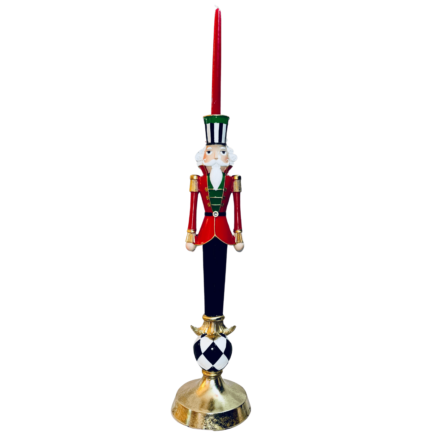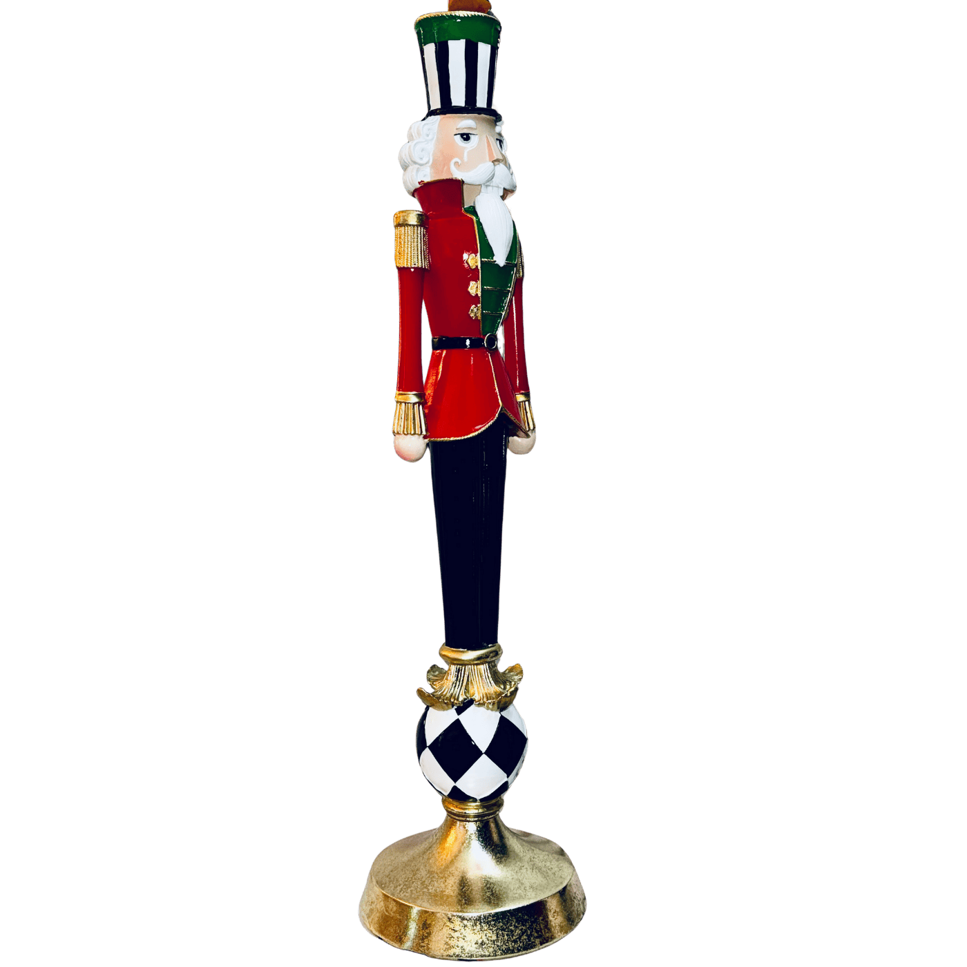 Un maestoso candelabro in resina che raffigura un elegante Schiaccianoci poggiato su una palla decorata con motivo a scacchi, per un effetto scenografico di grande impatto visivo.