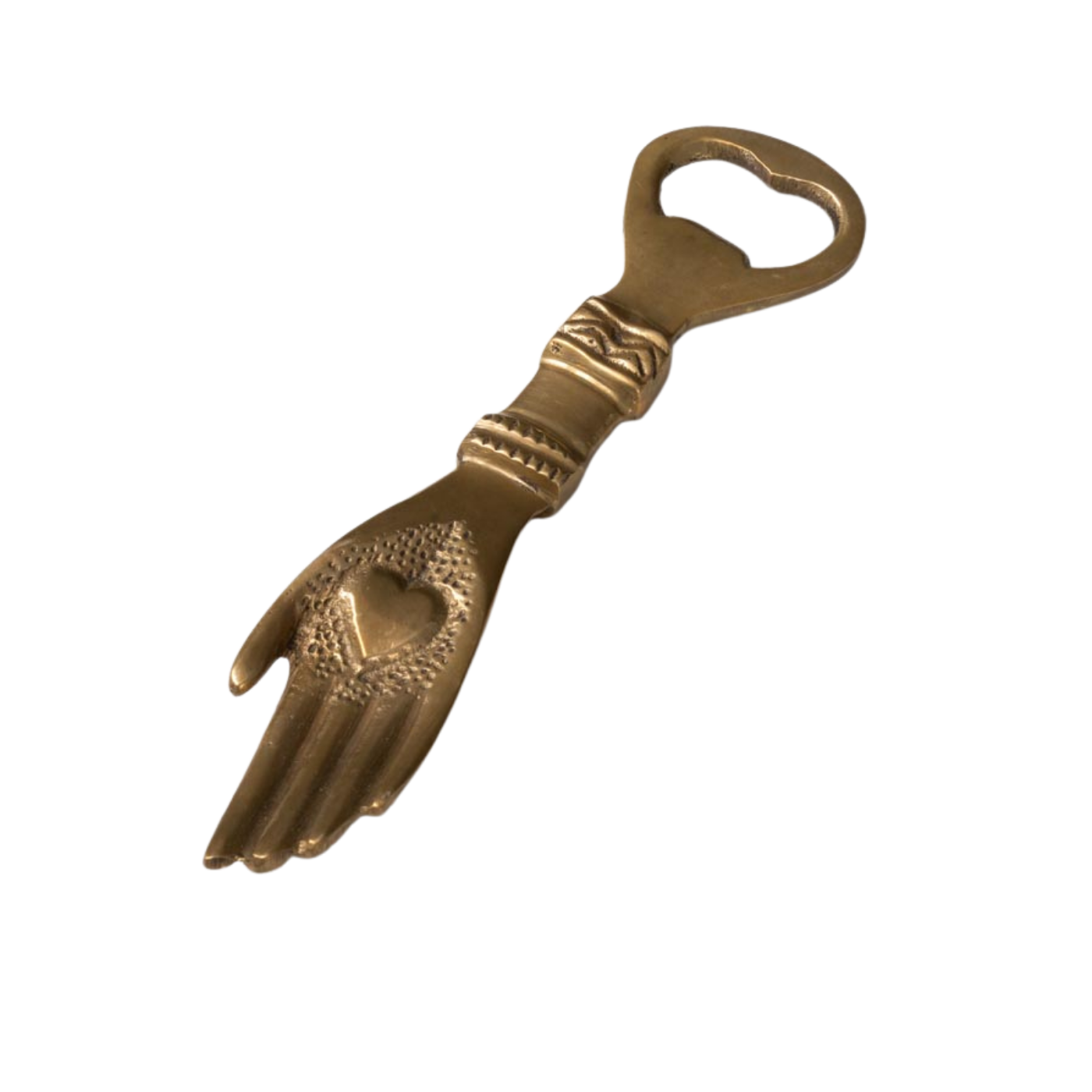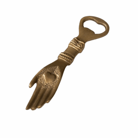 Apribottiglia in ottone a forma di mano con cuore Ex-voto. Oggetto dal gusto vintage e spirituale, perfetto da esporre o regalare. Un accessorio che fonde arte sacra e funzione in modo originale.