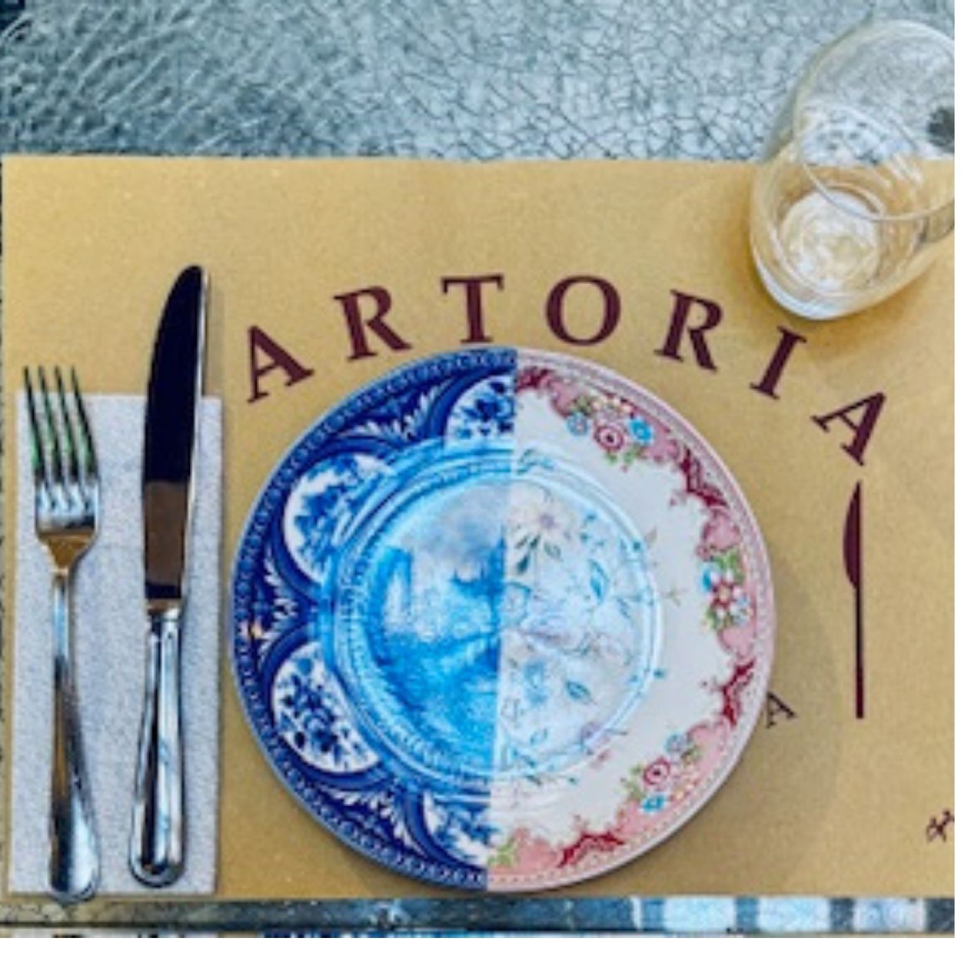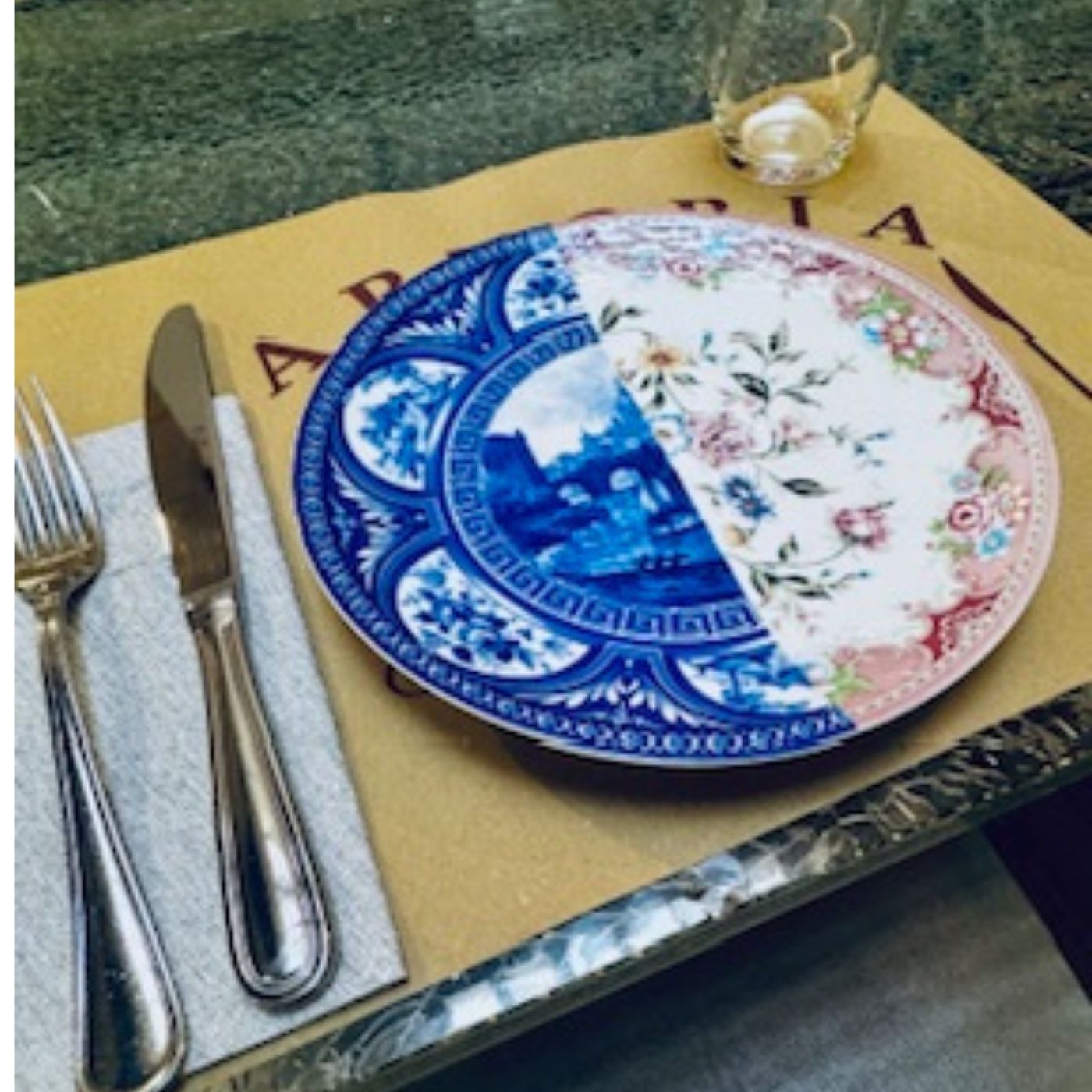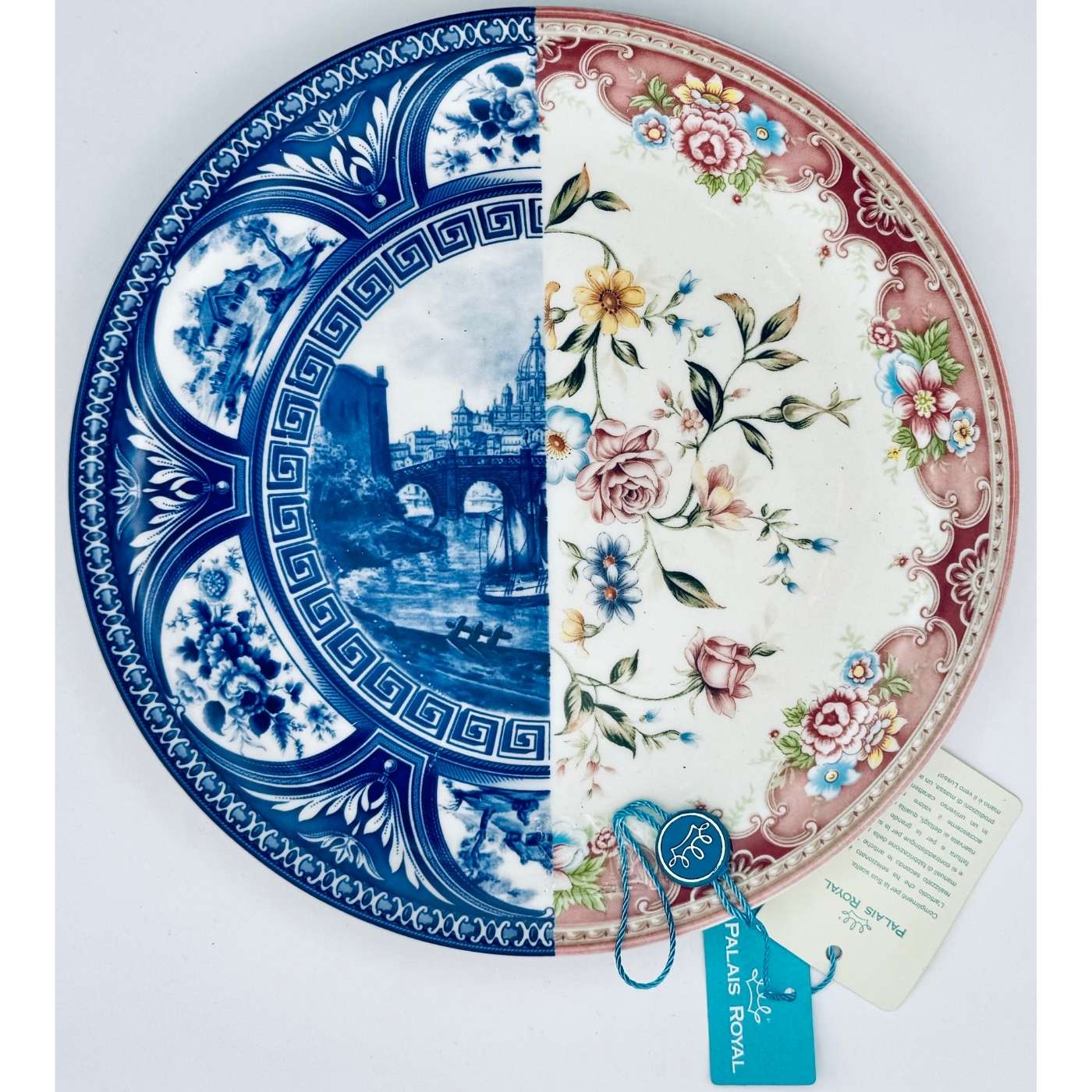 Piatto decorativo tondo con motivo a metà. Design grafico e ironico, perfetto per tavole colorate, brunch creativi o arredamento da cucina.