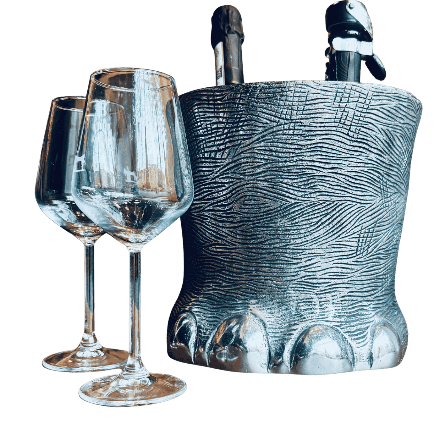 Secchiello per ghiaccio a forma di zampa d’elefante, in alluminio. Un accessorio da tavola originale e imponente, perfetto per cene scenografiche o aperitivi chic.