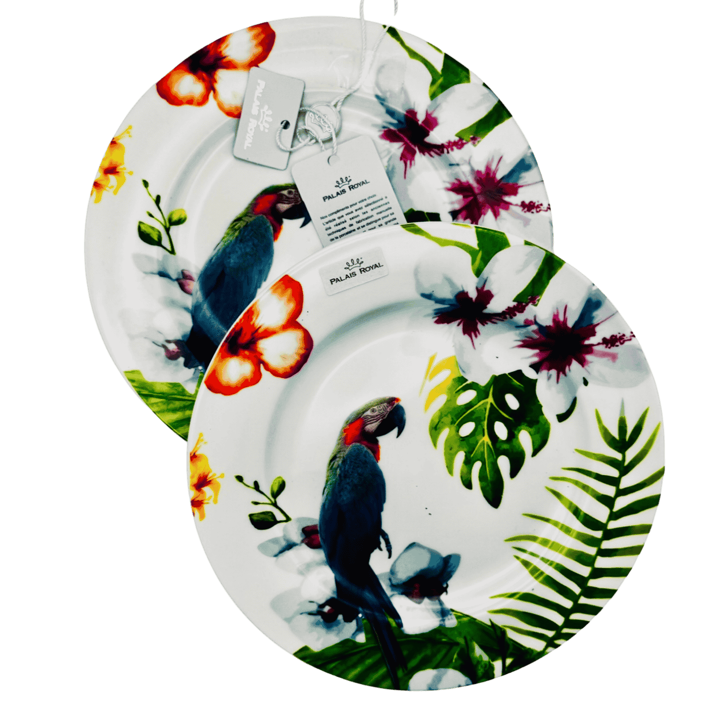 Set di due piattini decorativi in ceramica con stampa di pappagalli. Colori vivaci e stile tropicale per una tavola allegra e fantasiosa. Perfetti anche come elemento d’arredo o idea regalo.
