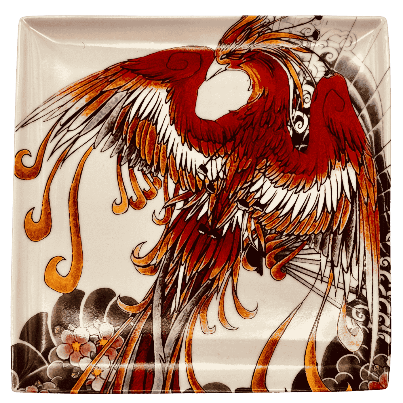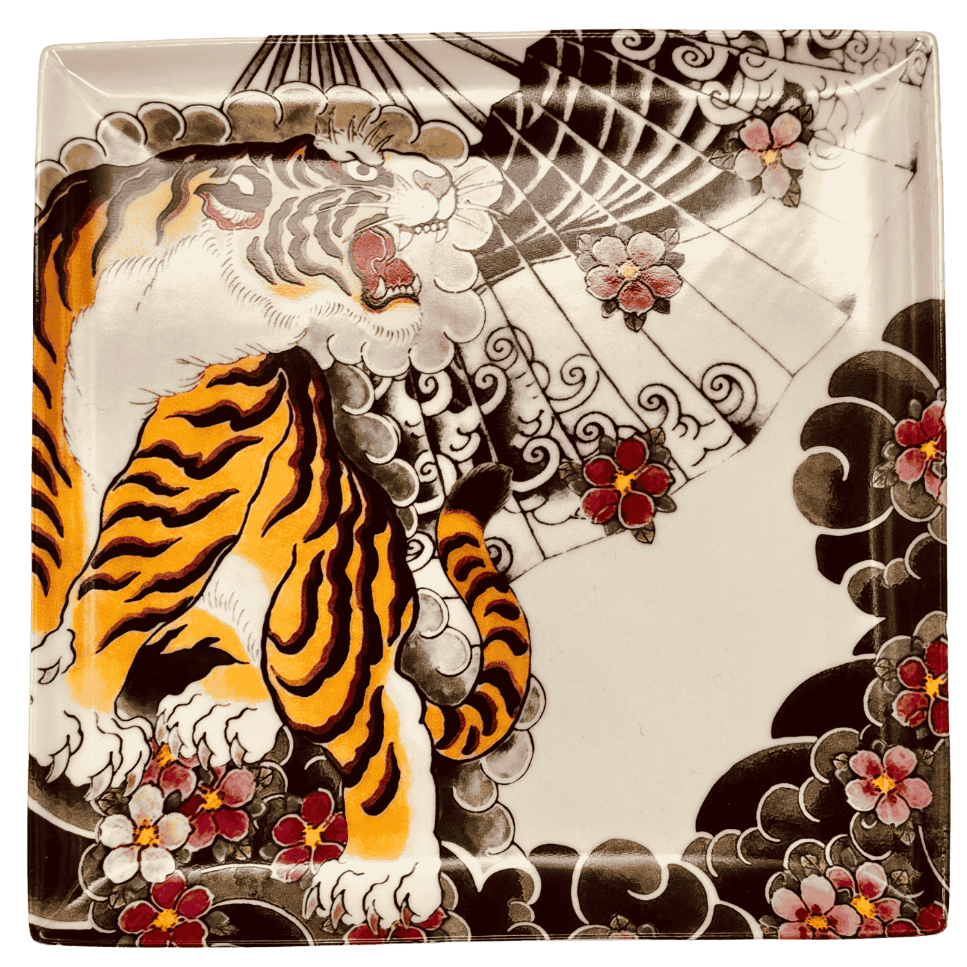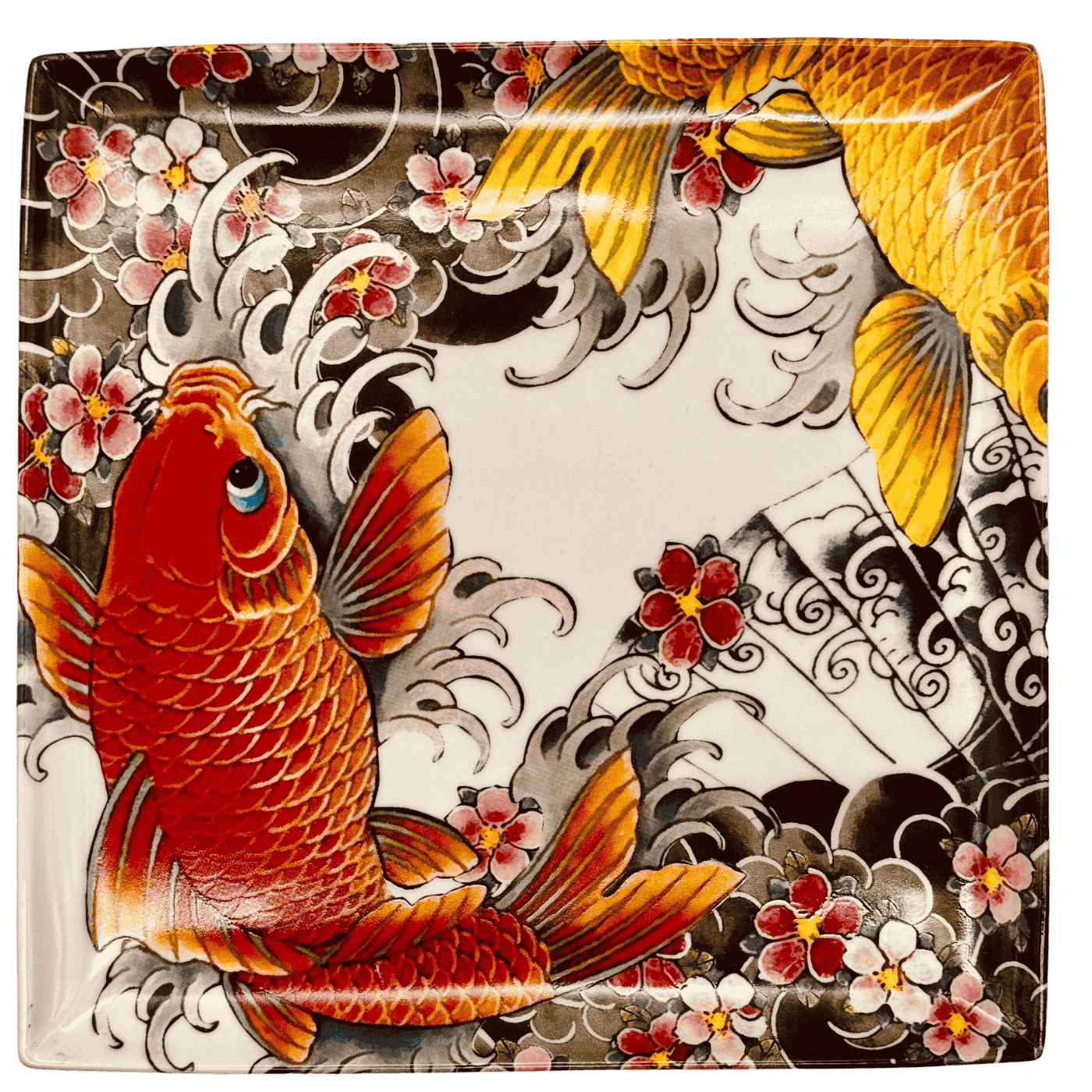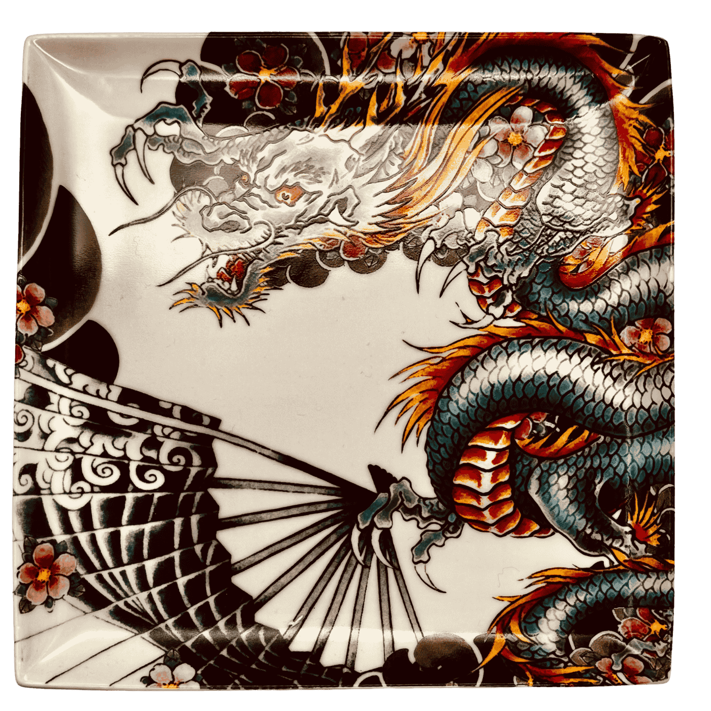 Set di quattro piatti piani 22×22 cm in fine porcellana, decorati in stile tattoo giapponese con quattro soggetti iconici: la Tigre, le Carpe, il Drago e la Fenice.