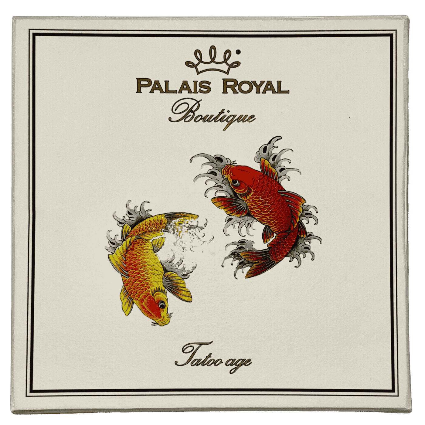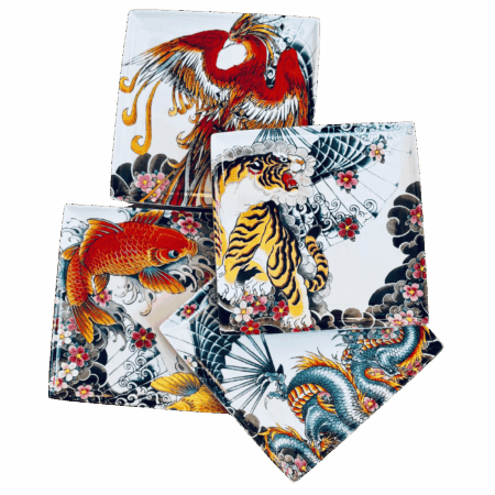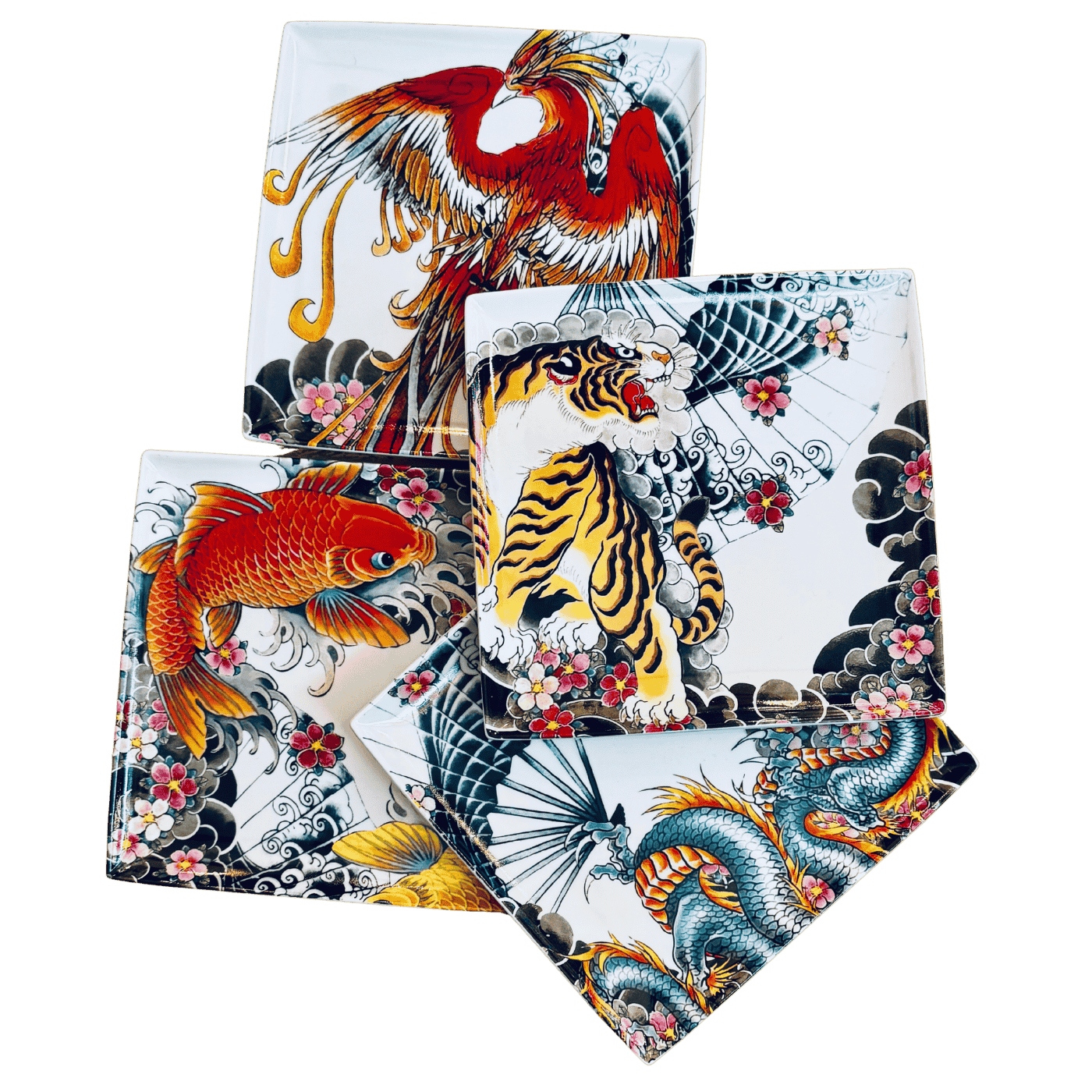 SET 4 PIATTI TATTO 16X16 cm in fine porcellana, decorati in stile tattoo giapponese con quattro soggetti iconici: la Tigre, le Carpe, il Drago e la Fenice.