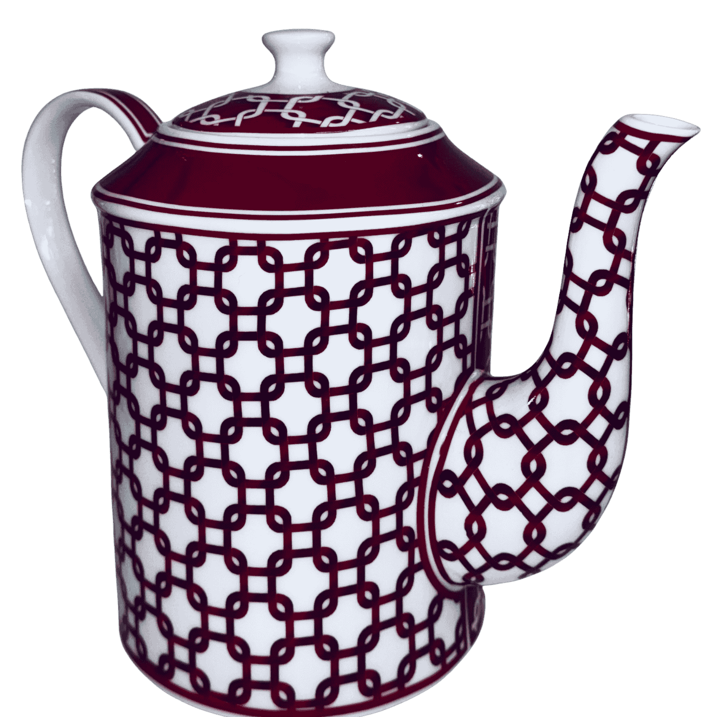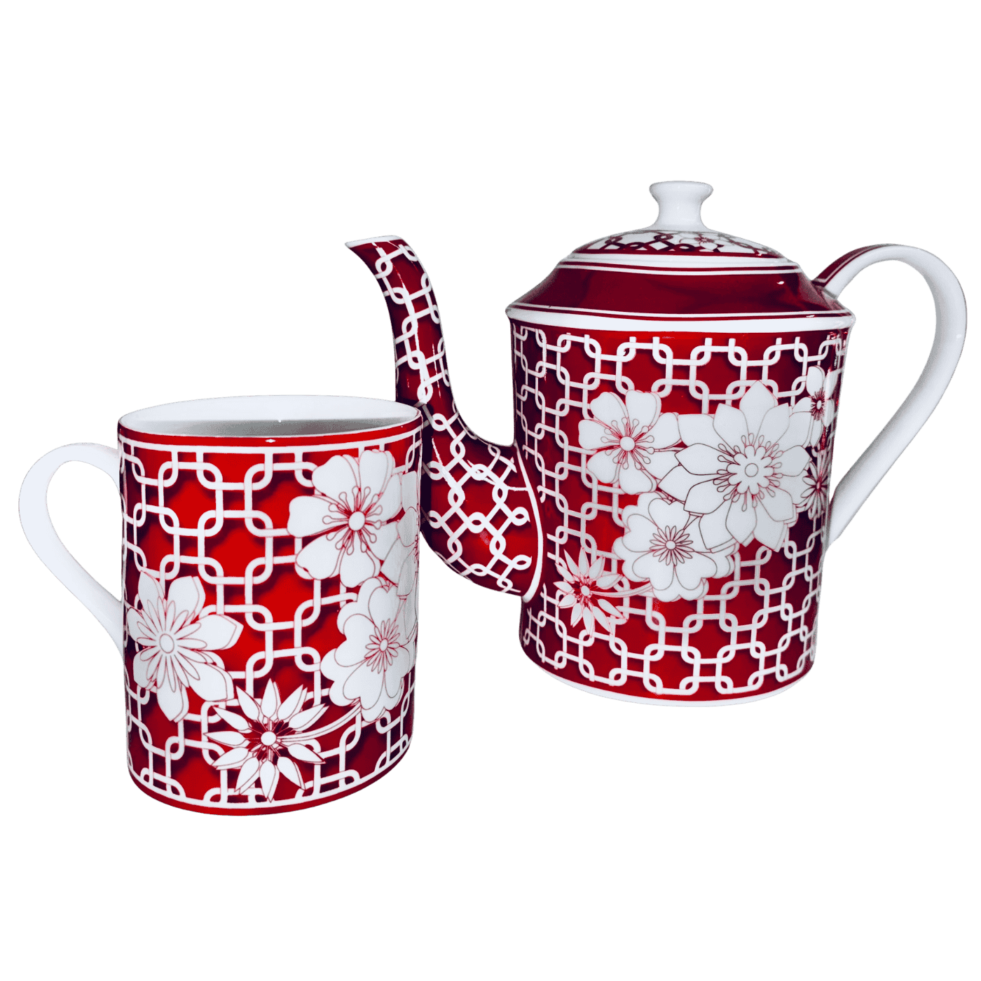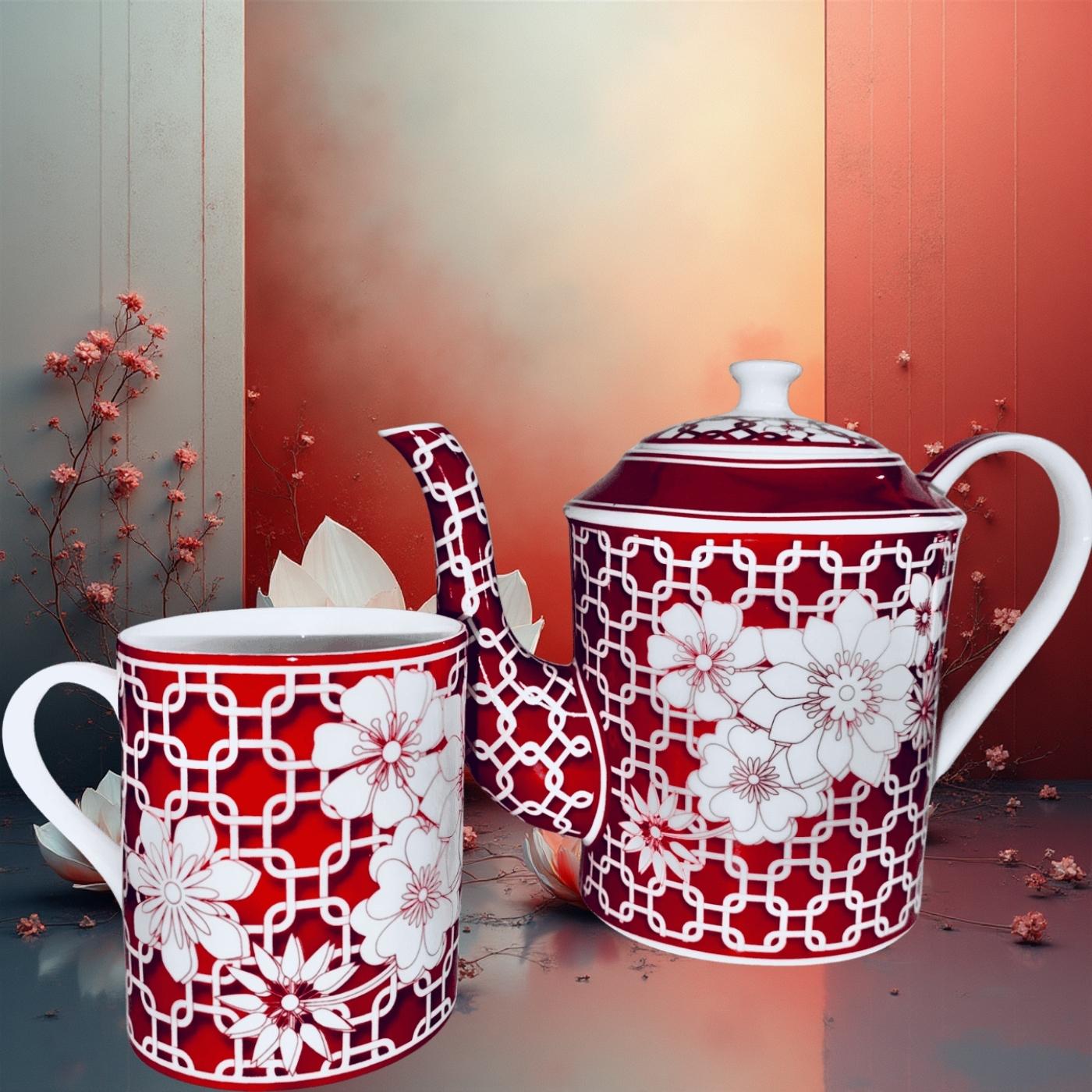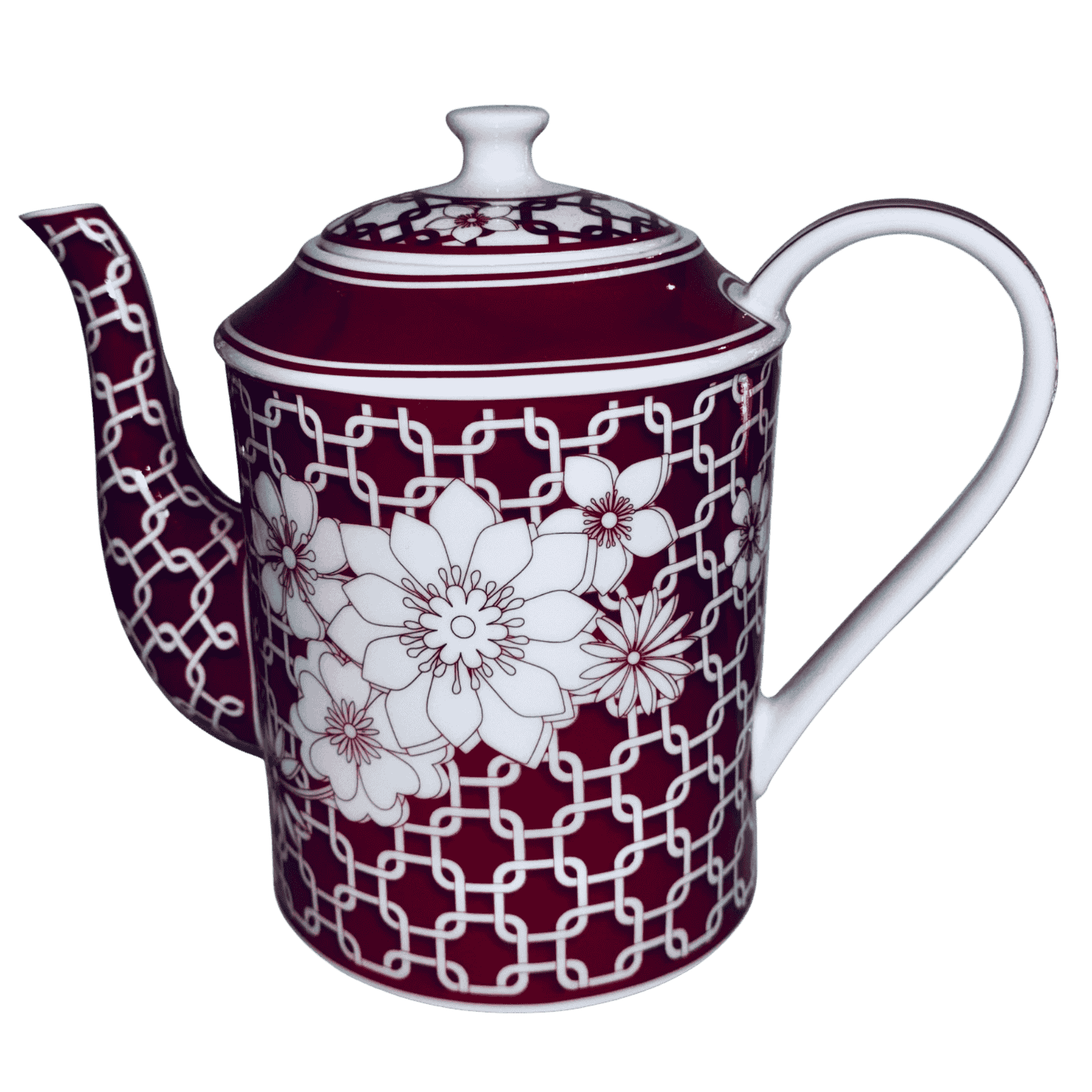 Teiera in porcellana dal raffinato stile Decò, caratterizzata da uno sfondo bianco e rosso arricchito da eleganti fiori bianchi. La decorazione, delicata e armoniosa, dona un tocco classico e decorativo alla tavola. Ideale per servire tè e infusi con stile, combina estetica, qualità e praticità, rendendo ogni momento di degustazione ancora più piacevole.