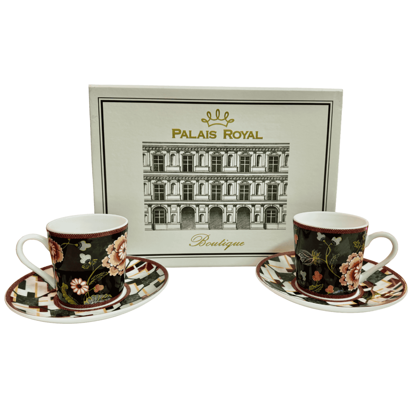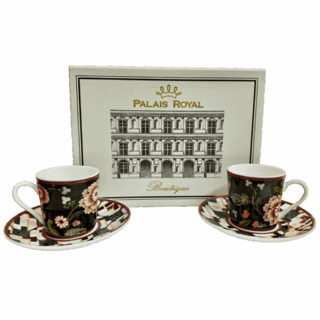 Elegante coppia di tazze da caffè in fine porcellana, caratterizzate da un raffinato decoro tropicale. Il fondo nero mette in risalto i dettagli colorati dei fiori esotici e la figura di un pappagallo bianco, creando un effetto vivace e contemporaneo. Perfette per impreziosire la pausa caffè con un tocco di stile e originalità, sono ideali sia per l’uso quotidiano sia come idea regalo.