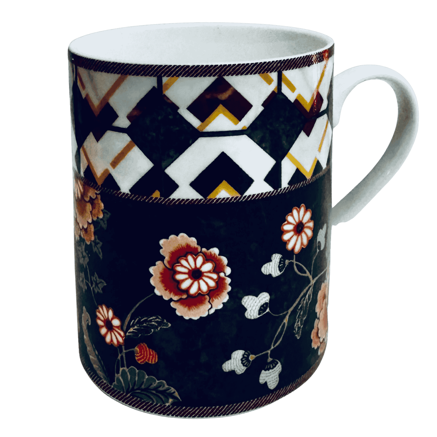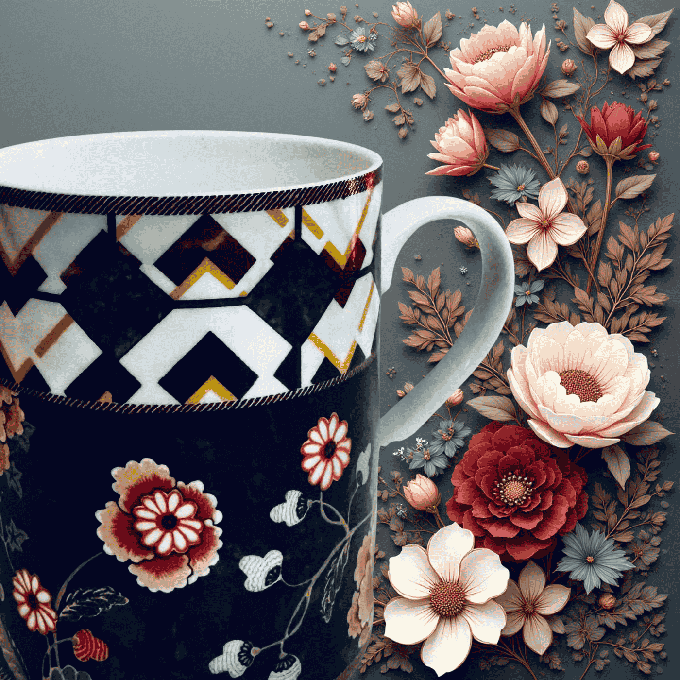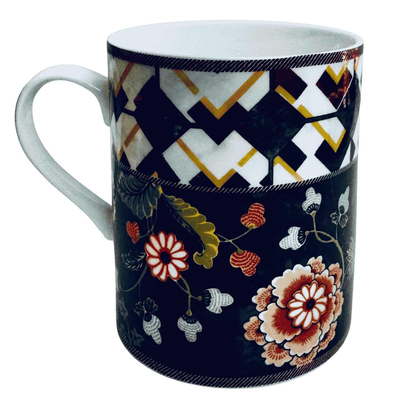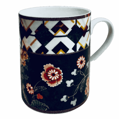 Tazza in porcellana decorata con elegante motivo tropicale: sfondo nero intenso che mette in risalto fiori dai colori vivaci e un raffinato pappagallo bianco. Design moderno ed esotico, ideale per aggiungere un tocco di stile alla pausa caffè o tè. Perfetta anche come idea regalo.