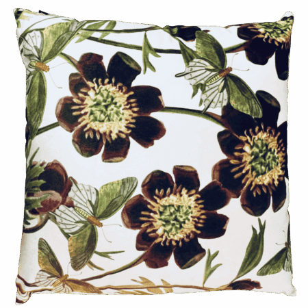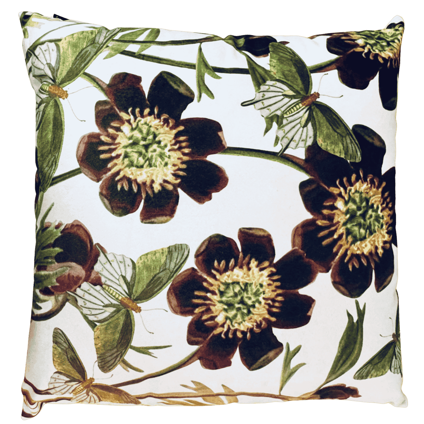 Cuscino velluto 50×50 “Chocolate” con stampa floreale e farfalle su fondo caldo. Retro in velluto avorio. Un equilibrio perfetto tra eleganza e natura. Adatto a ogni angolo della casa.